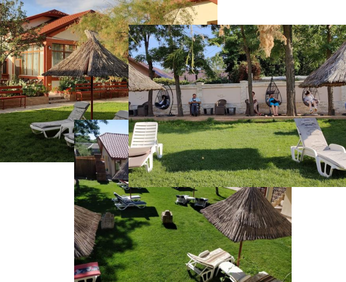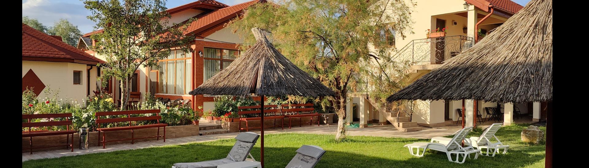 Pensiunea dispune de o curte mare cu gazon, umbrelute de stuf si sezlonguri, salon pentru servirea mesei.